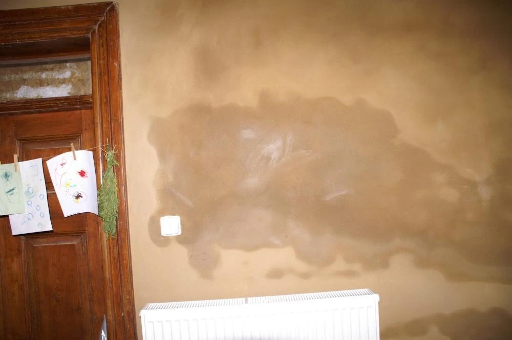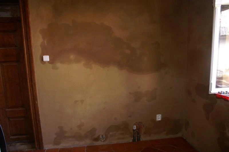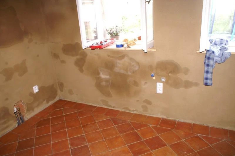 Tato lokální vlhkost se následně může projevit na hliněné omítce jako barevná odlišnost nebo mapování povrchu.