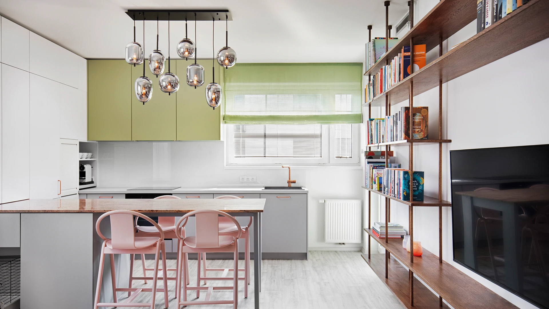 Interiér stojí na kombinaci jemných barev, dřeva a přírodních struktur. Dvojbarevná kuchyně pomohla upravit proporce místnosti a lépe ji propojit s obývacím prostorem. Návrh citlivě pracuje s původní podlahou, dveřmi i částí nábytku, aby všechny prvky tvořily kompaktní a harmonický celek.