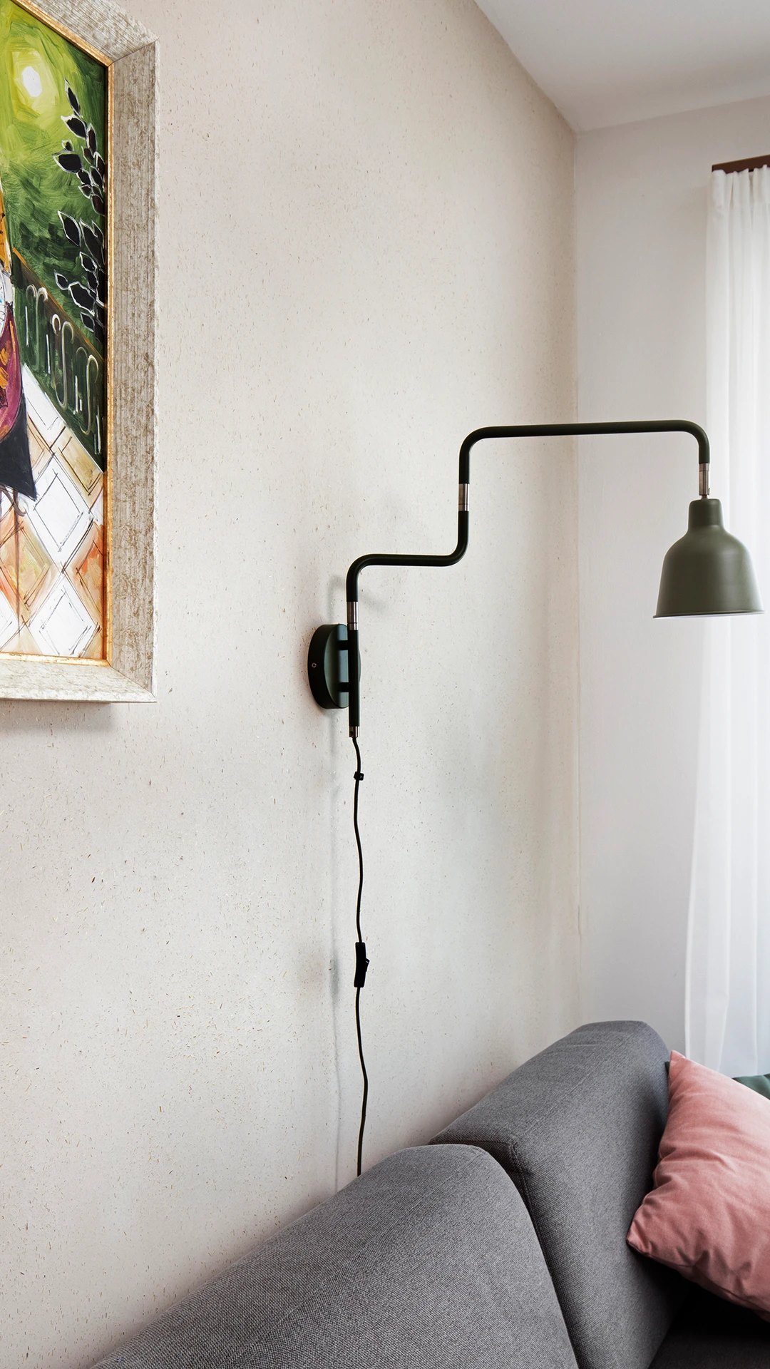 Ústředním prvkem obývacího pokoje se stala přírodní hliněná omítka PICAS Cottage, jejíž teplý odstín a jemná struktura s ručně přimíchanými travinami vytvářejí měkký, harmonický dojem. Omítka zároveň přispívá k lepší regulaci vlhkosti, akustice a celkovému komfortu místnosti.