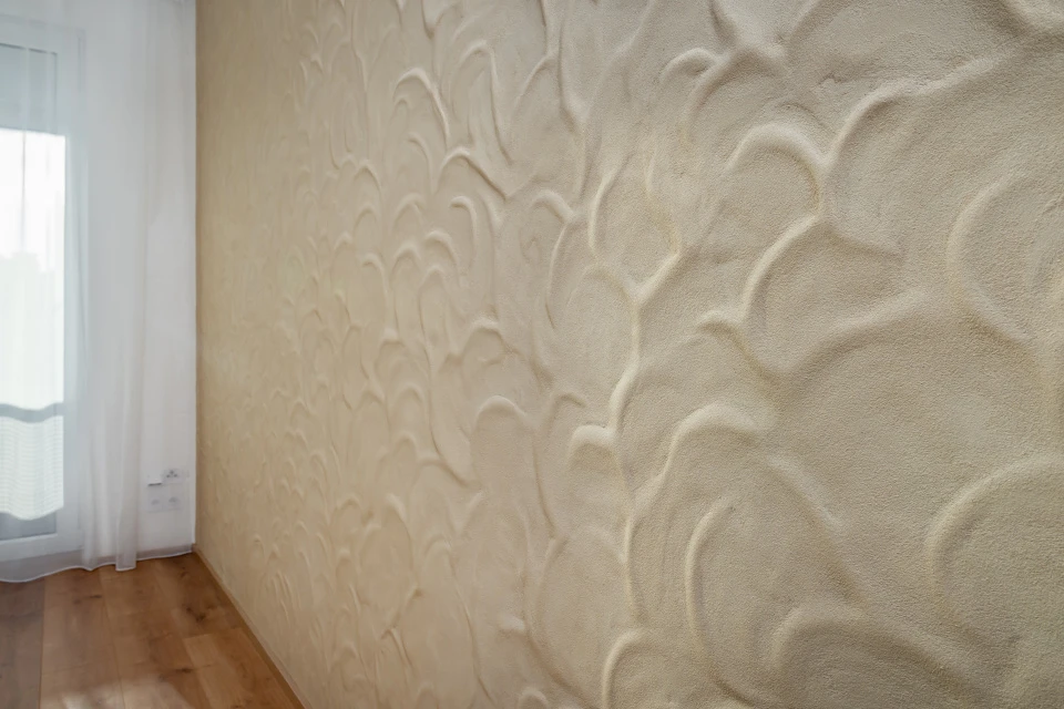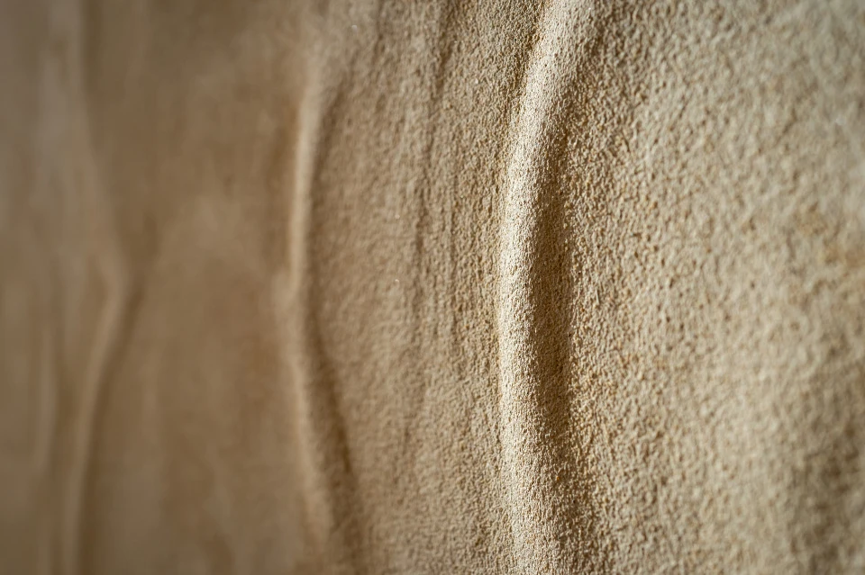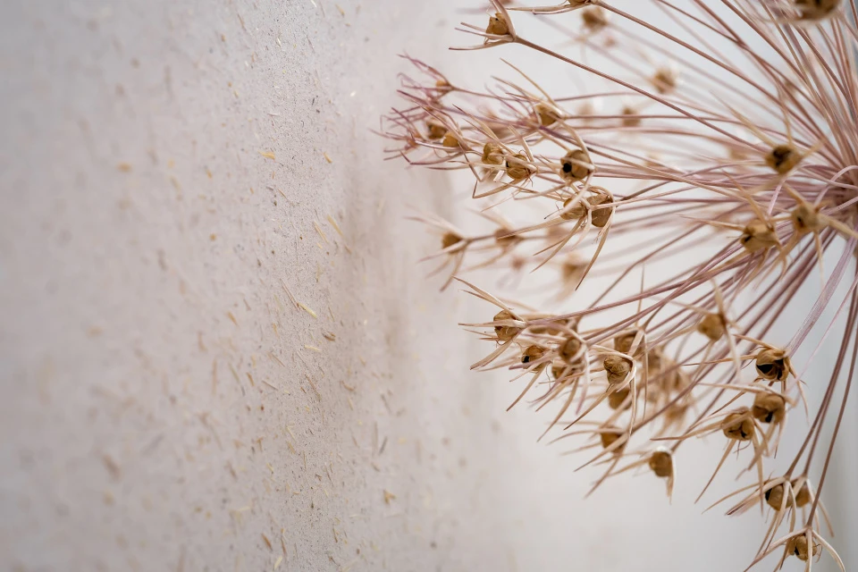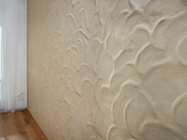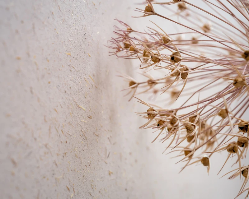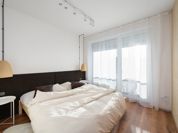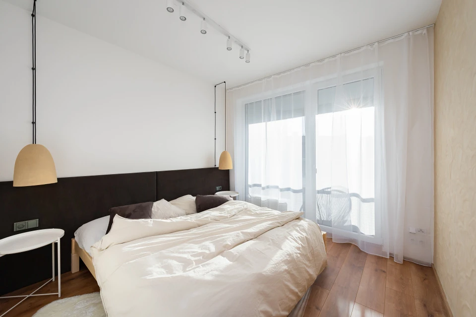 V ložnici byla použita hliněná omítka PICAS Econom, zvolená pro svůj klidný, neutrální tón podporující odpočinek. Kombinace obou povrchů s dřevem přináší bytu harmonii, lehkost a příjemnou haptickou kvalitu. Interiér je navržen tak, aby působil elegantně a zároveň příjemně pro dlouhodobé užívání.