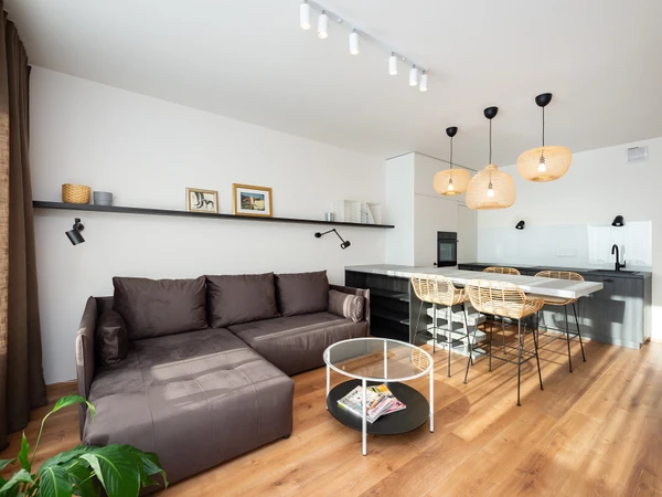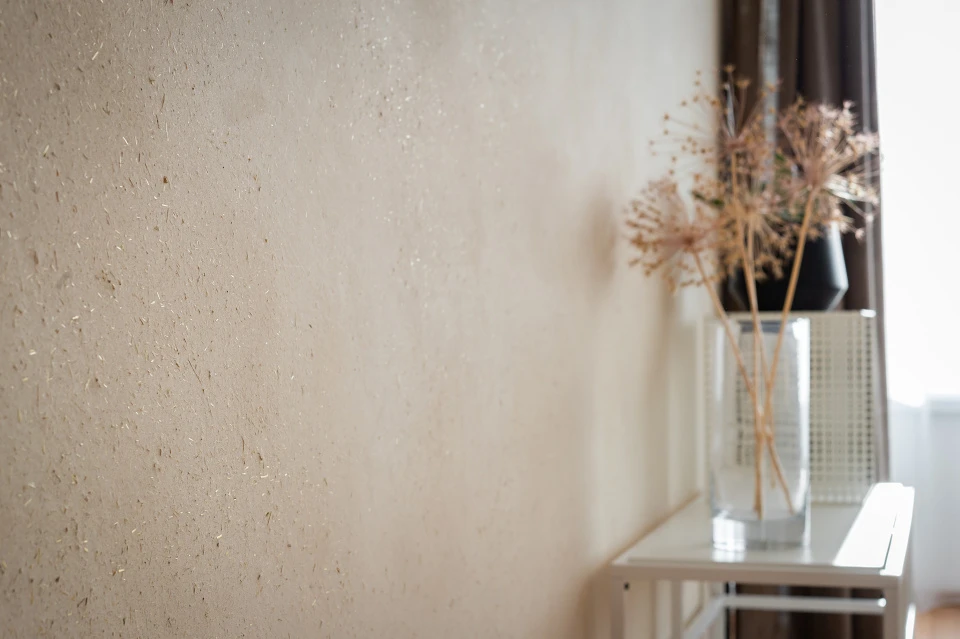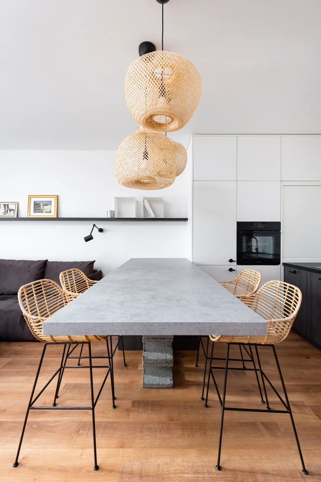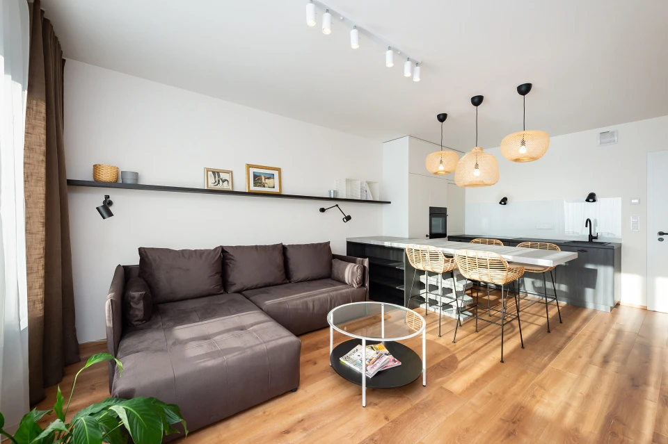 Interiér holešovického bytu byl navržen Ivou Hájkovou s důrazem na nadčasovost, jednoduchost a přírodní materiály. Klíčovým prvkem obývacího pokoje je hliněná omítka PICAS Cottage, která díky své jemné struktuře a teplému odstínu vytváří útulnou atmosféru a dodává prostoru přírodní charakter.