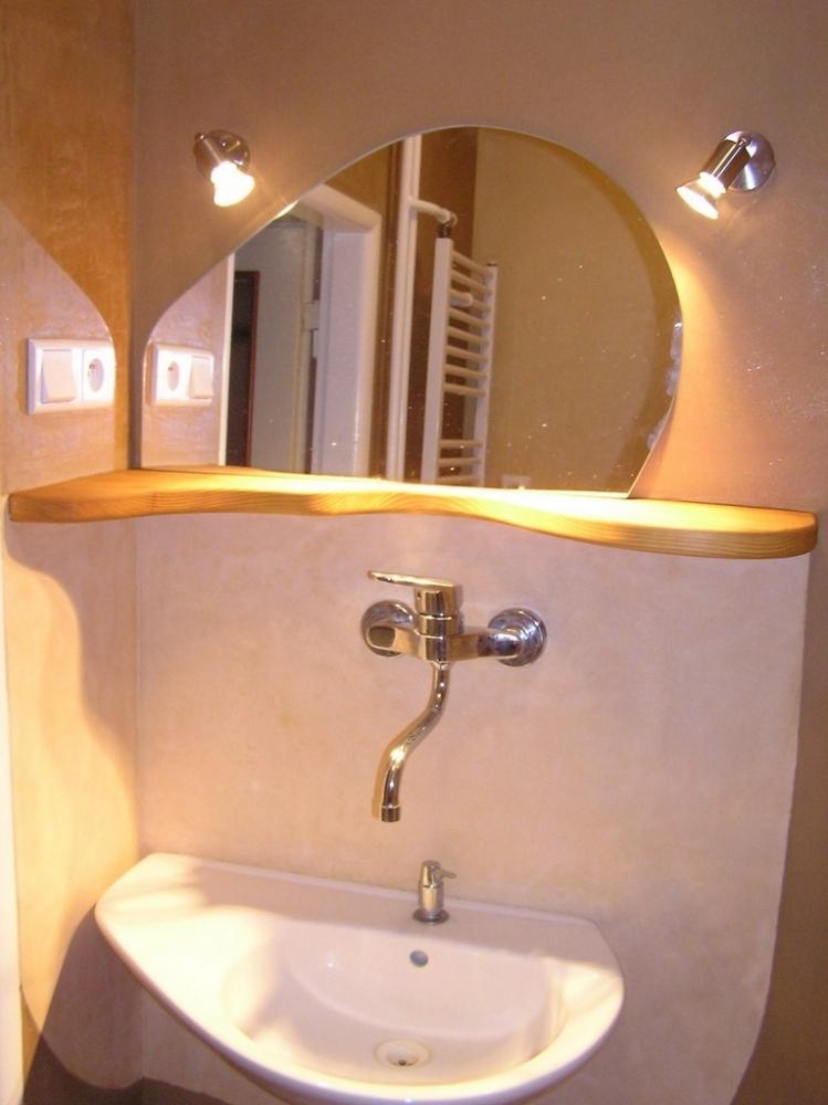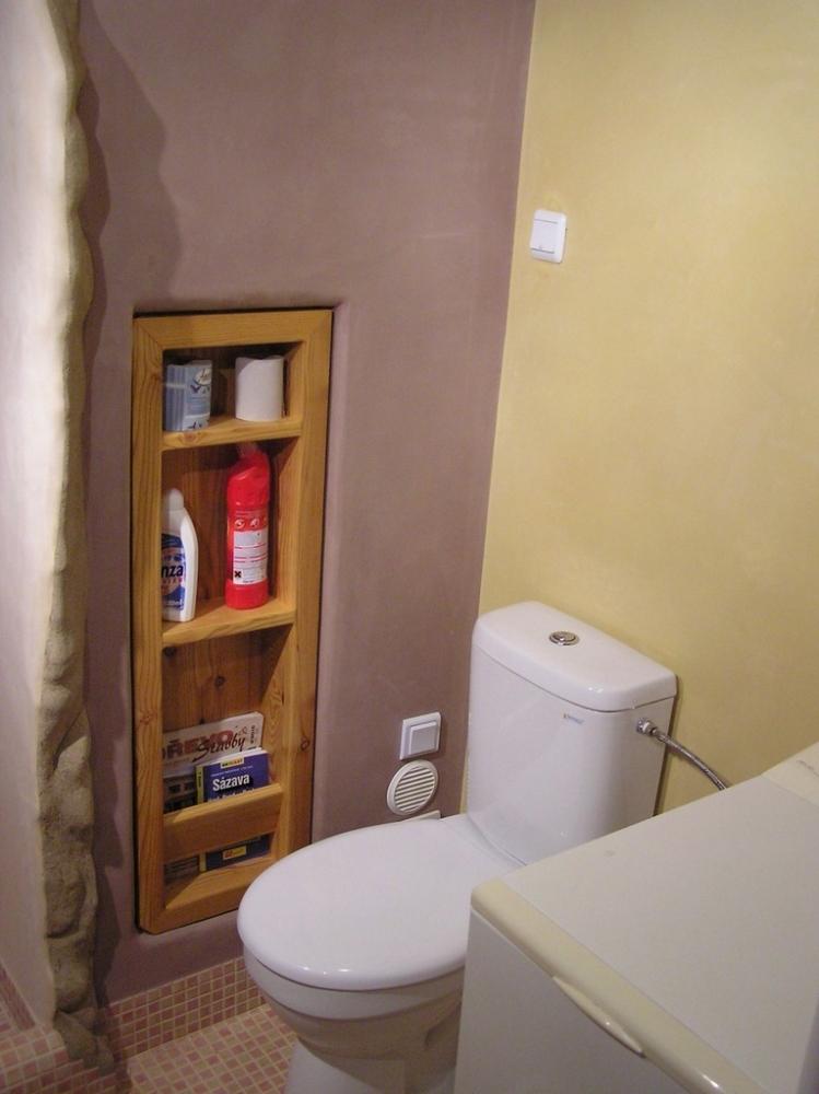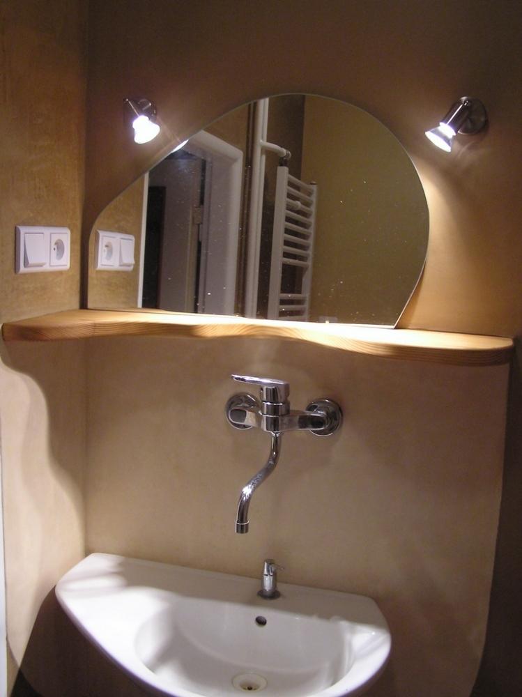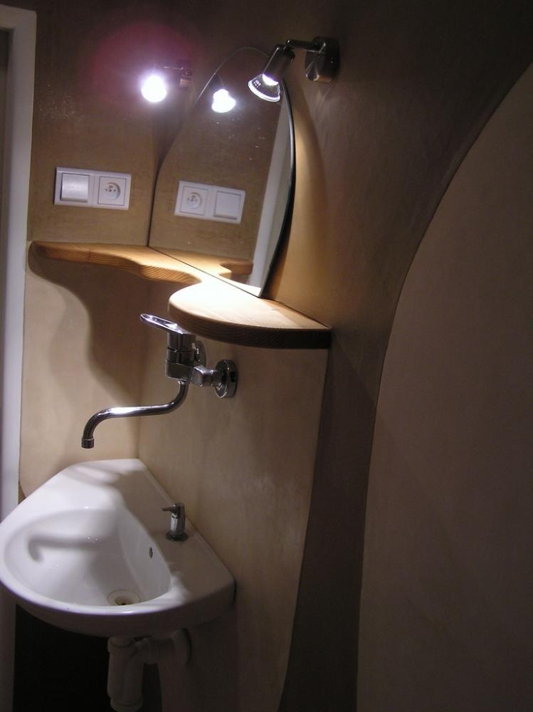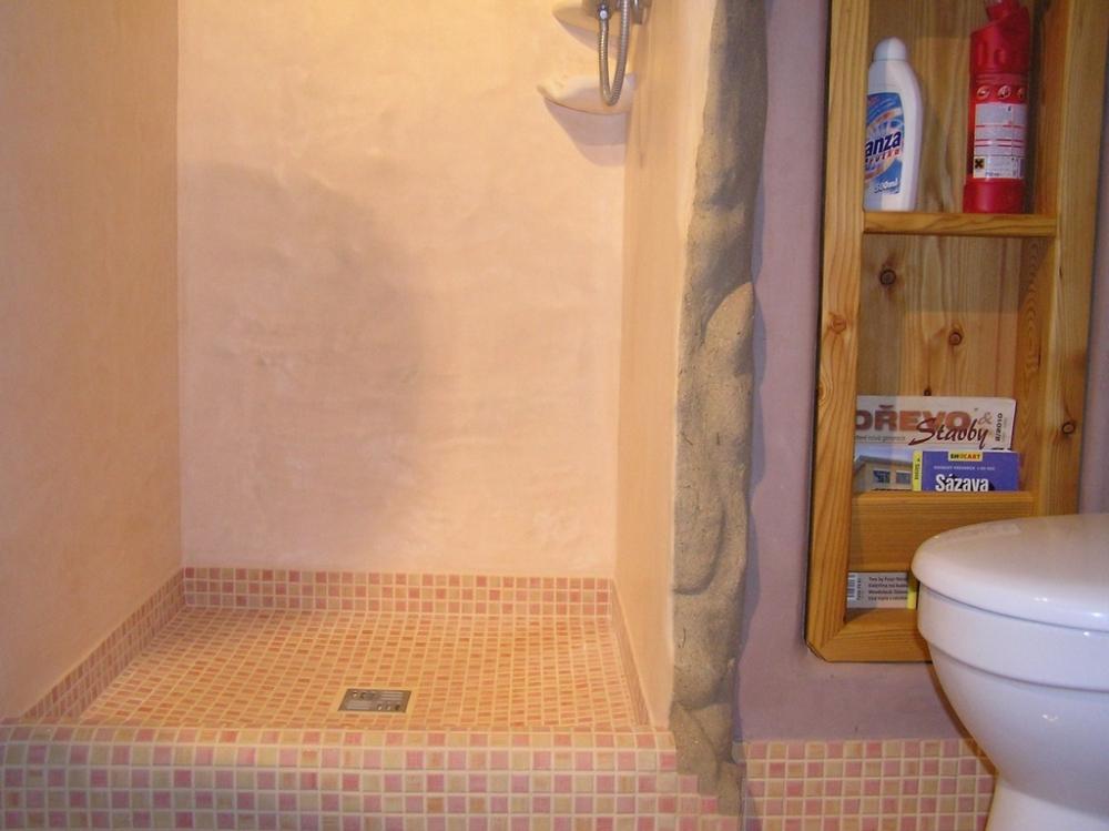 Jedná se o rekonstrukci 45let staré koupelny v cihovém bytovém domě. Původní omítka byla osekaná až na cihly, na kterých je 1,5-2,5cm hrubá hliněná omítka (jíl+ostrý písek). Vrchní vrstvy: stěna u umyvadla - čistý hnědý jíl zatažený štětcem, min. vrstva kvůli praskání *stěna kolem dveří - také čistý hnědý jíl vyhlazený plastovým hladítkem také min. vrstva *ostatní barevné stěny - barevný jíl + písek z Rudic zahlazené plastovým hladítkem, přesto dost náchylné na otěr, vrstva cca 2mm štuk *kolem umyvadla - padelakt namýchaný dle vlastního receptu (proto ten název), pracovní postup stejný jako u tadelaktu od Kreidezeitu - hlazeno kamenem, aplikováno na hrubé hliněnné omítce *sprchový kout - stejné jako u umyvadla, pouze pro nedostatek času (také v rámci experimentu) hlazeno pouze plastovým hladítkem, jako u jílových omítek. Zde je pod štukem na hrubé hliněnné omítce natažena perlinka s flexi lepidlem. Toto lepidlo jsem použil záměrně, abych měl nějakou jistotu v jakési hydroizolaci, kdyby snad padelakt propouštěl. Poličky ve sprše je vysochaný ytong, pouze mýdlenka je hodně složitá, tak se nepovedla ani na podruhé nanést v požadované kvalitě, tak jsem druhou vrstvu obrousil, že jina nanesu znovu, ale zůstalo u obroušeného - designově zajimavé, zbytek prověří čas...