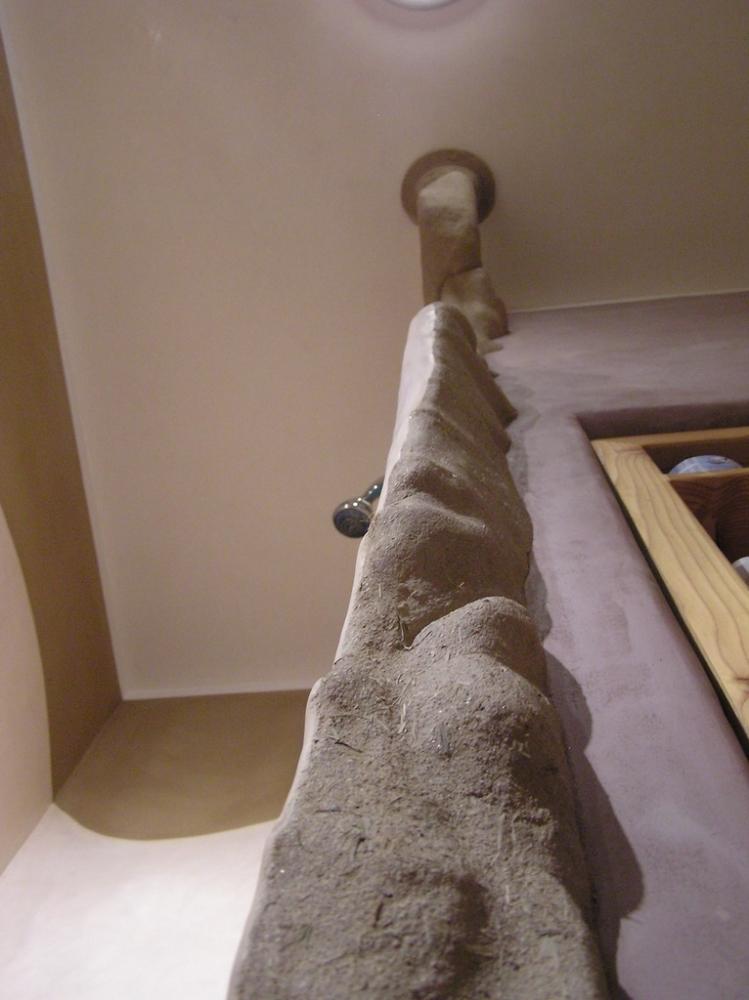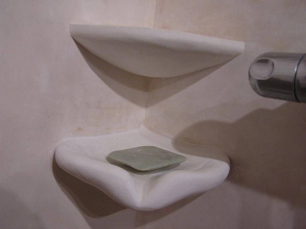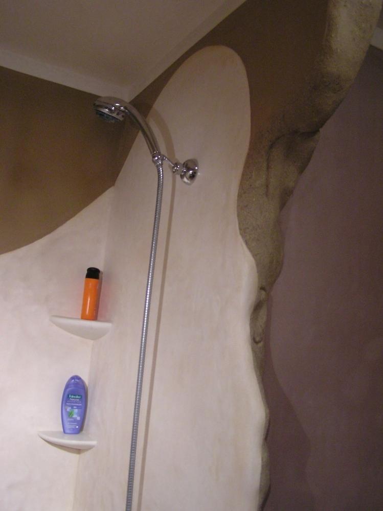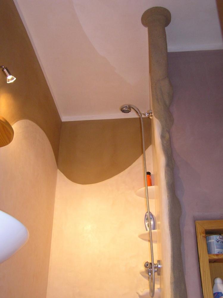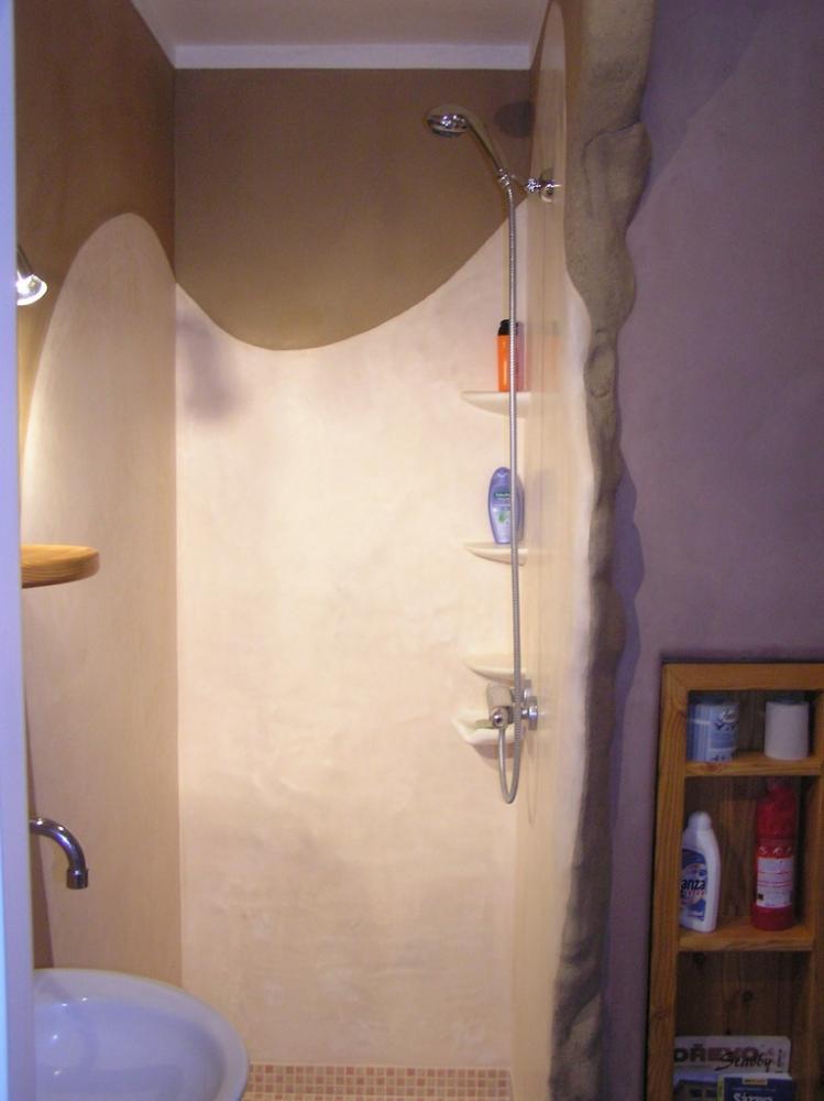 Jedná se o rekonstrukci 45let staré koupelny v cihovém bytovém domě. Původní omítka byla osekaná až na cihly, na kterých je 1,5-2,5cm hrubá hliněná omítka (jíl+ostrý písek). Vrchní vrstvy: stěna u umyvadla - čistý hnědý jíl zatažený štětcem, min. vrstva kvůli praskání *stěna kolem dveří - také čistý hnědý jíl vyhlazený plastovým hladítkem také min. vrstva *ostatní barevné stěny - barevný jíl + písek z Rudic zahlazené plastovým hladítkem, přesto dost náchylné na otěr, vrstva cca 2mm štuk *kolem umyvadla - padelakt namýchaný dle vlastního receptu (proto ten název), pracovní postup stejný jako u tadelaktu od Kreidezeitu - hlazeno kamenem, aplikováno na hrubé hliněnné omítce *sprchový kout - stejné jako u umyvadla, pouze pro nedostatek času (také v rámci experimentu) hlazeno pouze plastovým hladítkem, jako u jílových omítek. Zde je pod štukem na hrubé hliněnné omítce natažena perlinka s flexi lepidlem. Toto lepidlo jsem použil záměrně, abych měl nějakou jistotu v jakési hydroizolaci, kdyby snad padelakt propouštěl. Poličky ve sprše je vysochaný ytong, pouze mýdlenka je hodně složitá, tak se nepovedla ani na podruhé nanést v požadované kvalitě, tak jsem druhou vrstvu obrousil, že jina nanesu znovu, ale zůstalo u obroušeného - designově zajimavé, zbytek prověří čas...