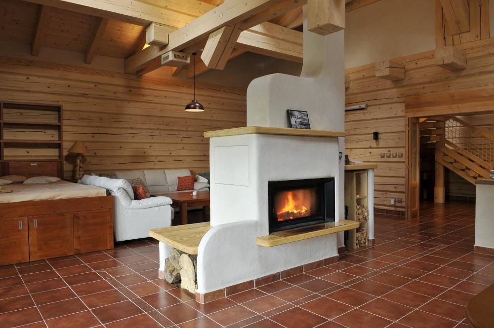 Interiér hlavní obytné místnosti – tvar krbového tělesa je navržen na míru a opatřen hliněnou omítkou Picas Cottage, stejná hliněná omítka je použita nad roubením místnosti a také ve štítu.