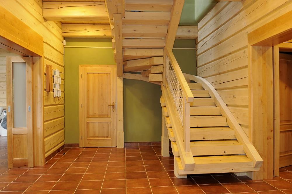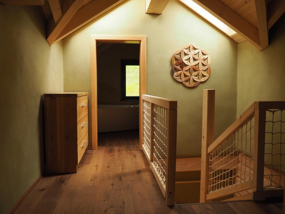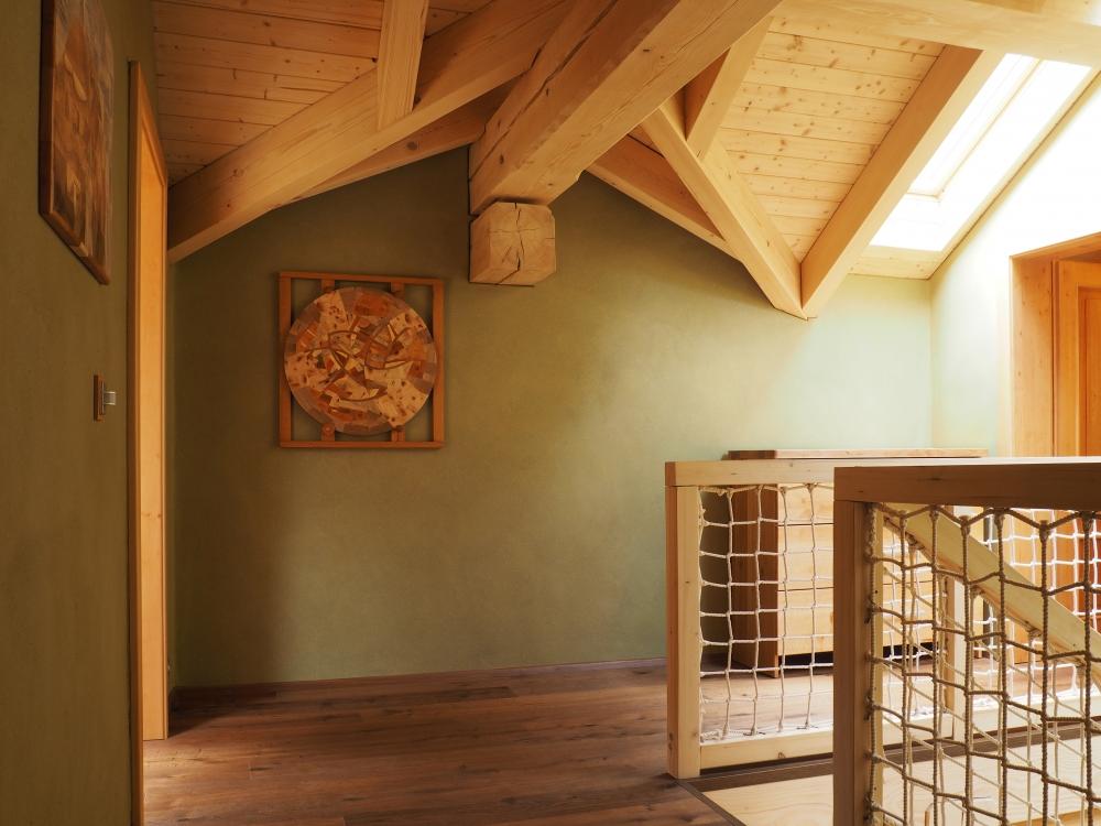 Horní schodišťová hala s hliněnou sytě zelenou omítkou. V interiéru jsou umístěny dřevěné obrazy od pana Patřičného (www.patricny.com).