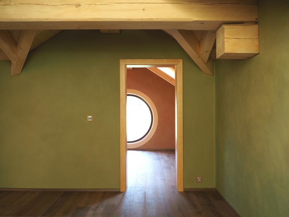 Pohled ze schodišťové haly do ložnice – inenzivní kombinace zelené a červené omítky.