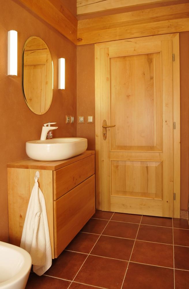 Do koupelny byla vybrána červená hliněná omítka Cottage.