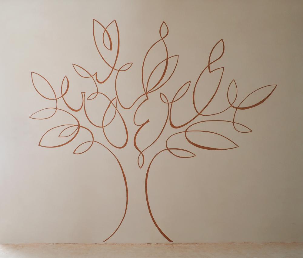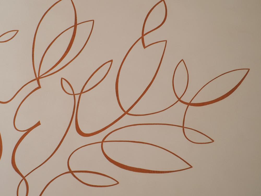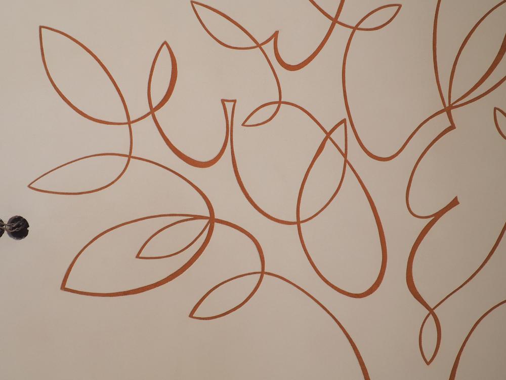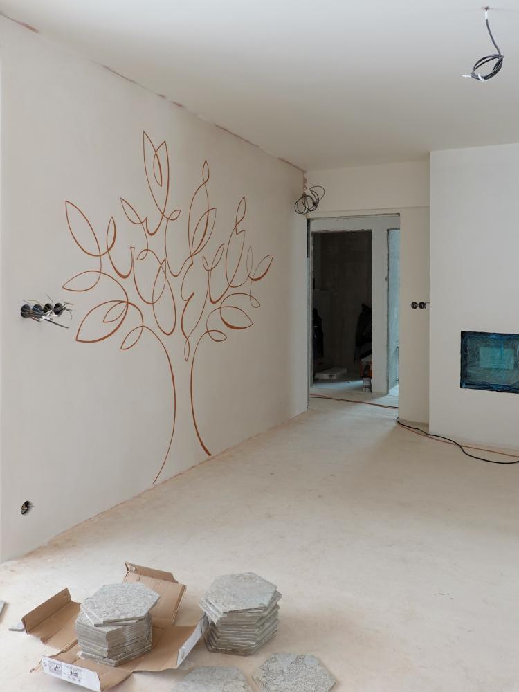 Lineární sgrafito v hliněné omítce. Nachází se v hlavní obytné místnosti rodinného domu, použité omítky jsou Picas Ekonom jemná a Picas Art. Odstín červené spodní omítky byl laděn individuálně dle přání zákazníka tak, aby korespondoval s odstínem voděodolné stěrky v přilehlé kuchyni.