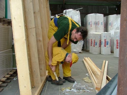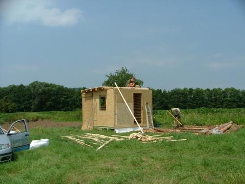 Základní kostru domku tvoří dřevěné sloupky přichycené k OSB desce