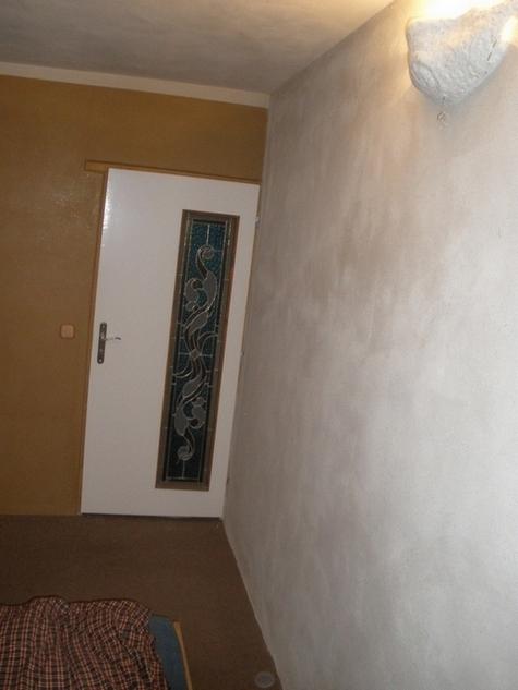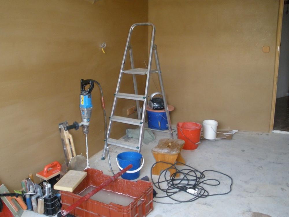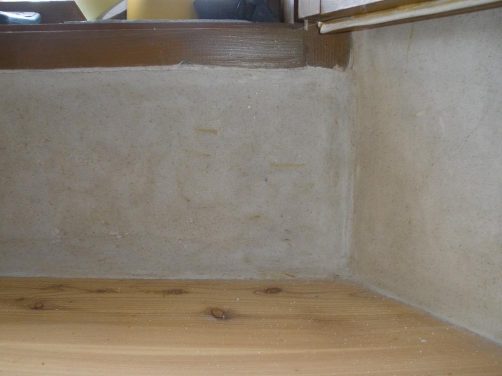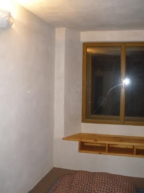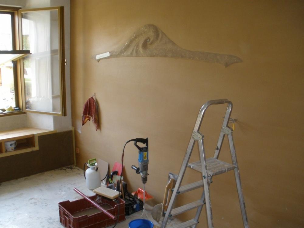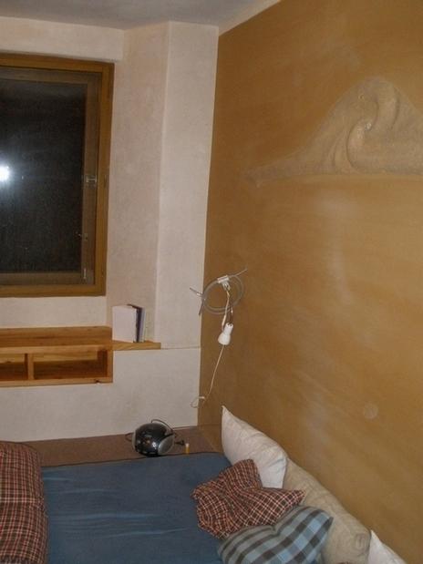 Bílá omítka : obsahuje cca 25% vápna, aby byla odolnější, kolem okna je leštěná, na stěně s topením filcovaná, aby vystoupil hrubší tmavý písek a kousky slámy (Rudice+hydrát). Hnědá omítka : jako finální vrstva je natažený čistý jíl a uhlazený štětkou (nakopaný Vysočina). Strop : bílý jíl s bílým pískem, filcováno, velmi náchylný na otěr, proto použito na strop (Rudice). Světlo se tvořilo na dvakráte, což při prohlídnutí fotografií, je všem jasné proč... Topení : stěnové, napojené na stávající radiátorový systém, přetažený perlinkou