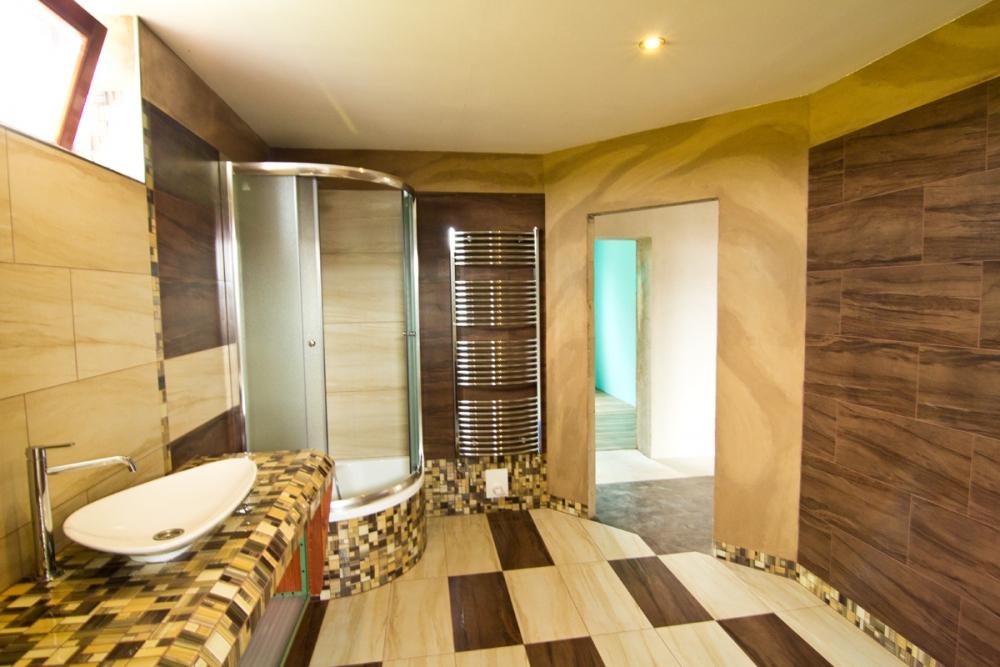 Hliněná omítka dvou barev v kombinaci s imitací australského pískovce se v konečném důsledku ukázala jako velmi dobrá volba, která umocnila celkový dojem koupelny. Použitý materiál - Picas econom jemná, dobarvená pigmenty od základní barvy do světlé a tmavé. Zpracováno v tl. 12 - 18 mm.