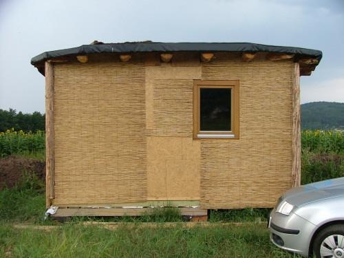 Na OSB desky se z venkovní strany přichytila rákosová rohož a na ni se nanesla hliněná omítka v síle 3 cm.
