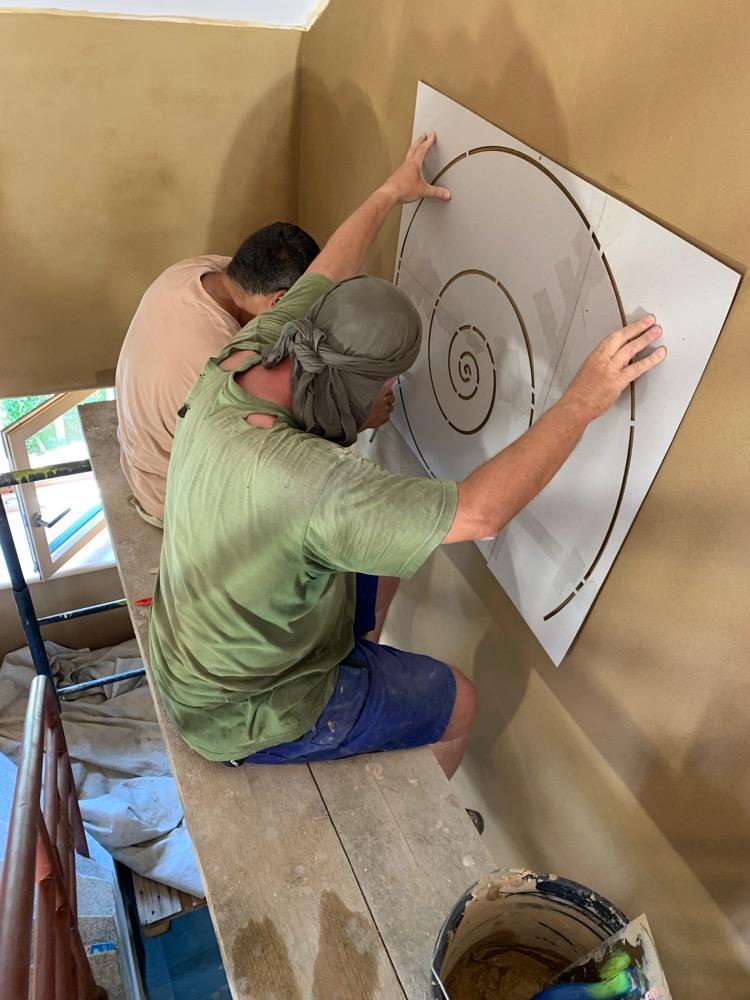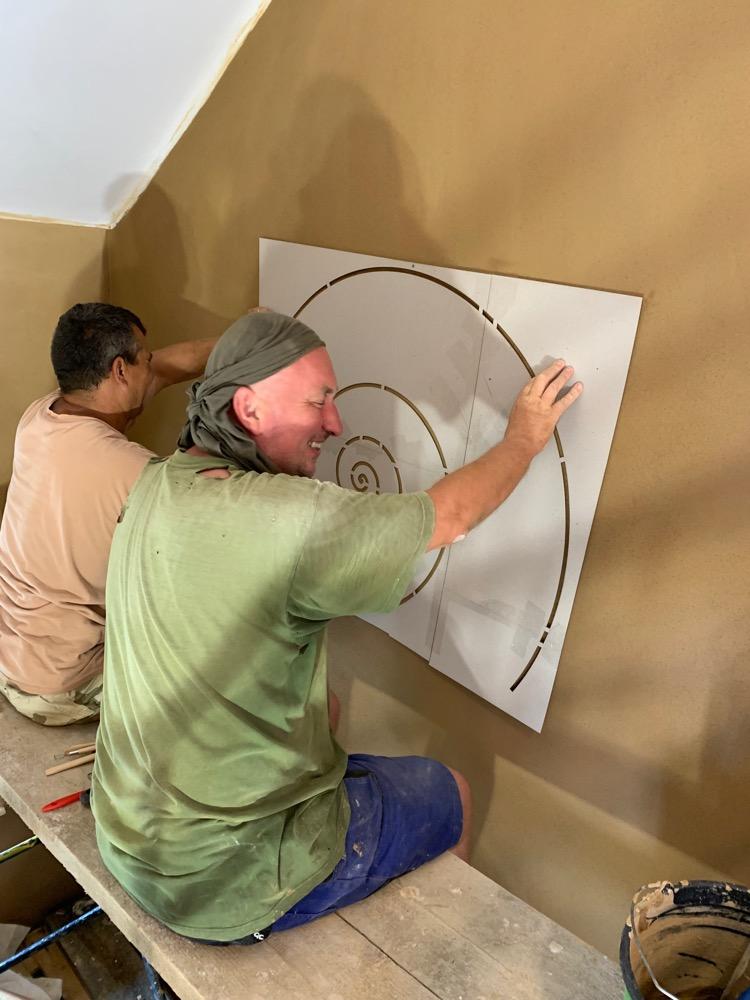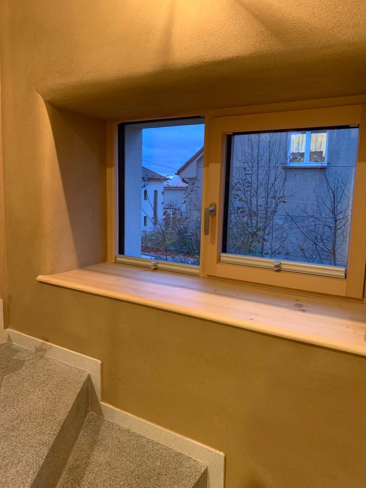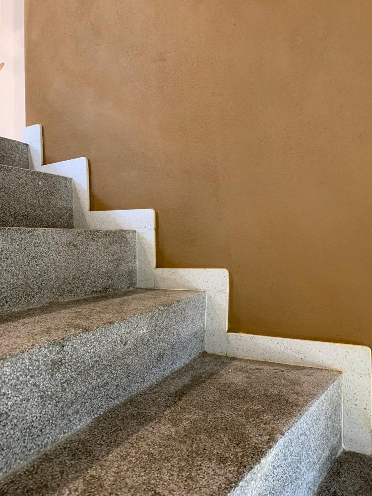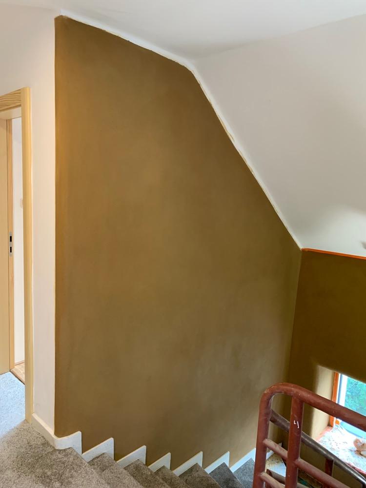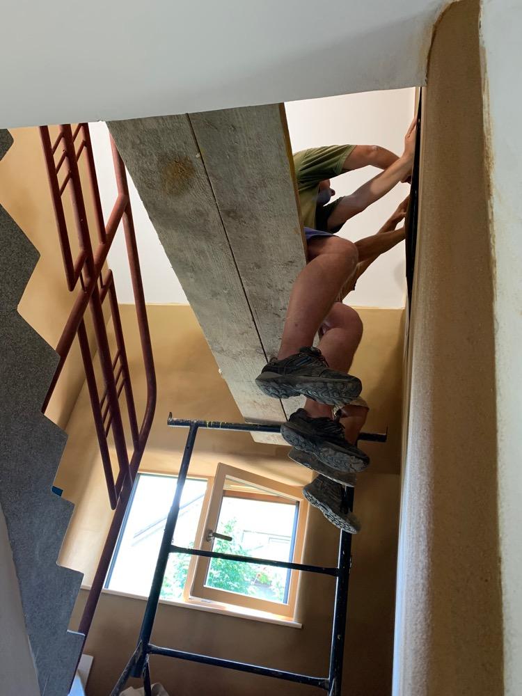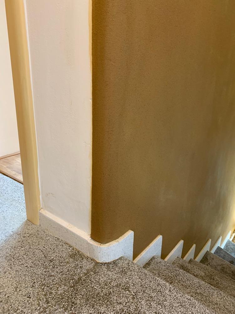 Při omítání stěn na schodišti se používala omítka antik bílá ze série ART a jemná světlá ze série Econom.