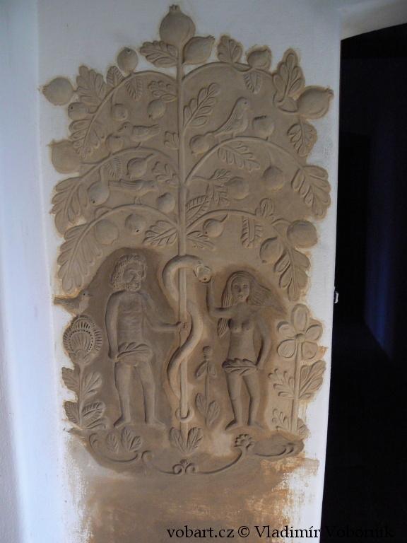 Celý interiér domu byl vytvořen v hliněných omítkách, které zmizely pod vápenným nátěrem a tak jsem hlínu několika málo prvky opět přivedl k životu.