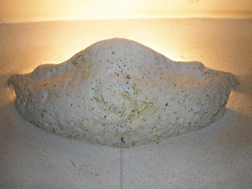 Bílá omítka : obsahuje cca 25% vápna, aby byla odolnější, kolem okna je leštěná, na stěně s topením filcovaná, aby vystoupil hrubší tmavý písek a kousky slámy (Rudice+hydrát). Hnědá omítka : jako finální vrstva je natažený čistý jíl a uhlazený štětkou (nakopaný Vysočina). Strop : bílý jíl s bílým pískem, filcováno, velmi náchylný na otěr, proto použito na strop (Rudice). Světlo se tvořilo na dvakráte, což při prohlídnutí fotografií, je všem jasné proč... Topení : stěnové, napojené na stávající radiátorový systém, přetažený perlinkou