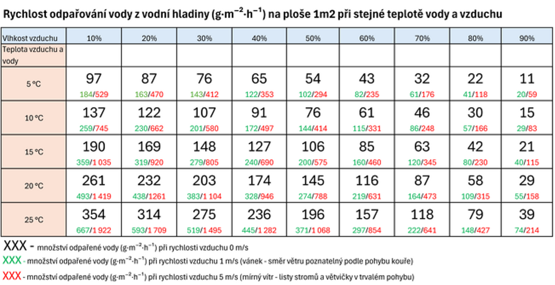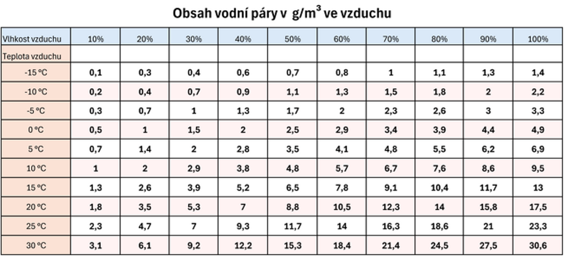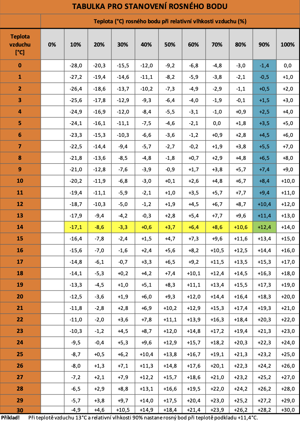 Když je povrch omítky/stěny příliš chladný, může se na něm srážet vlhkost a schnutí se zastaví. Tabulka níže ukazuje, kdy k tomu může dojít.