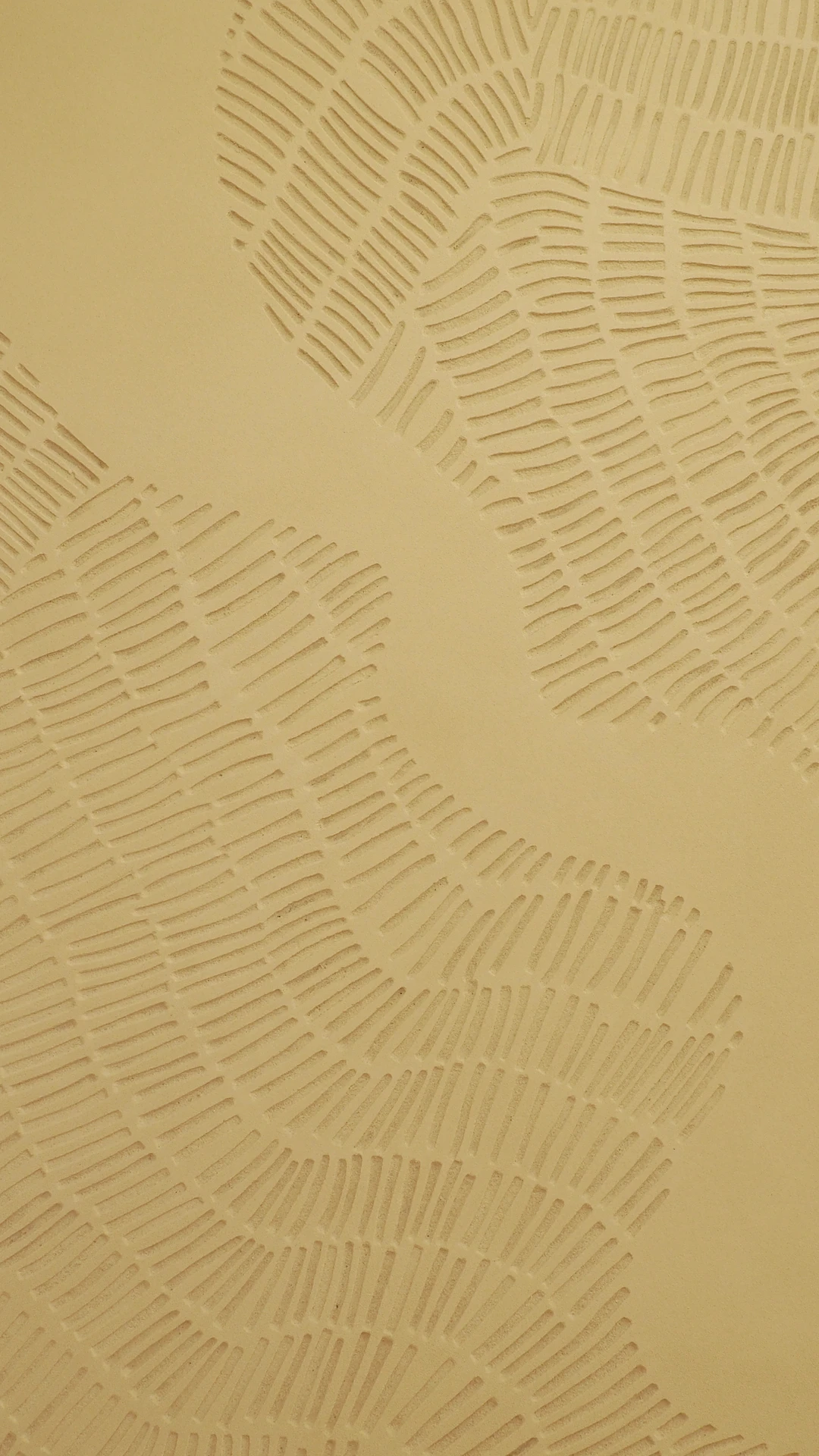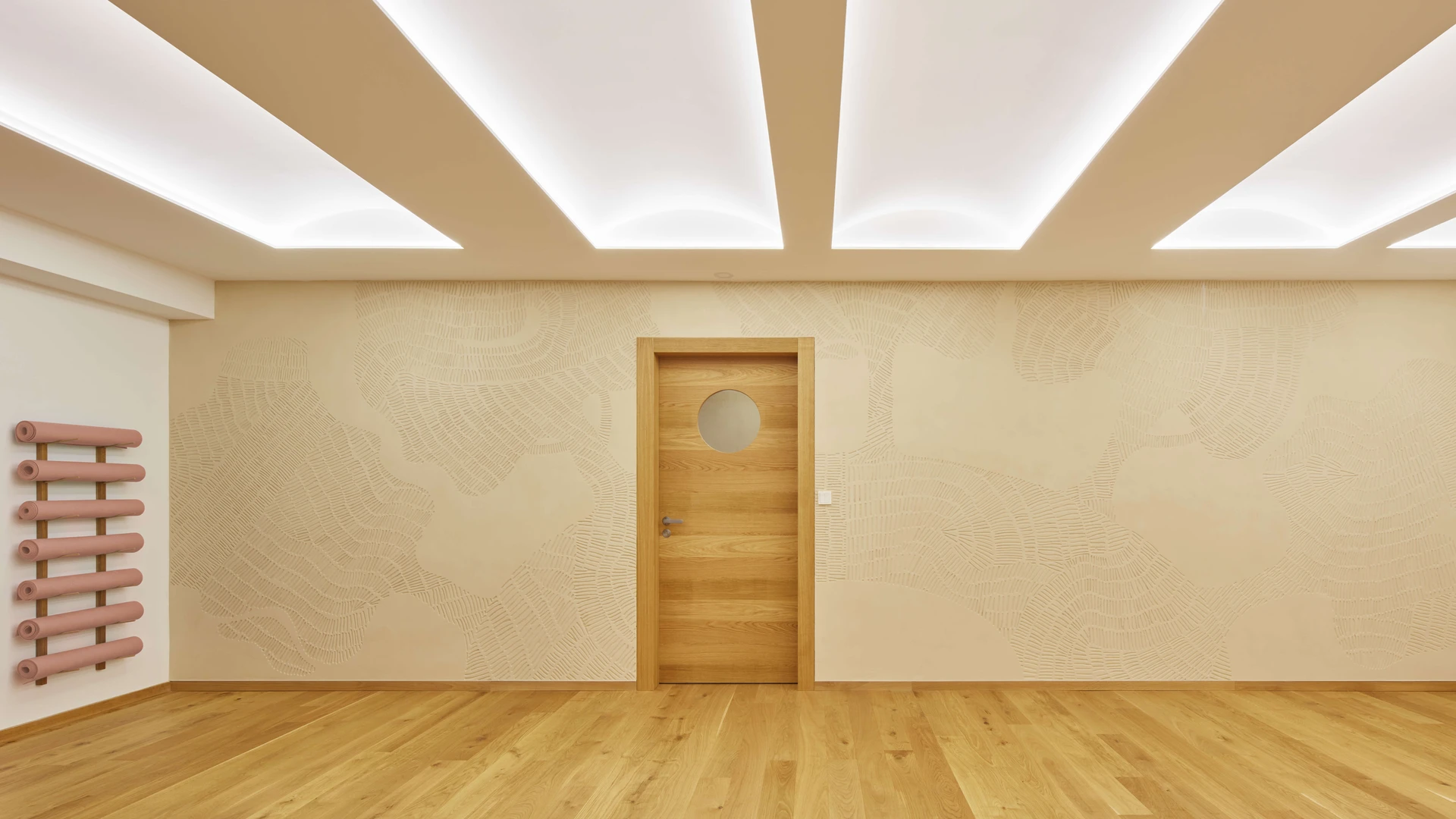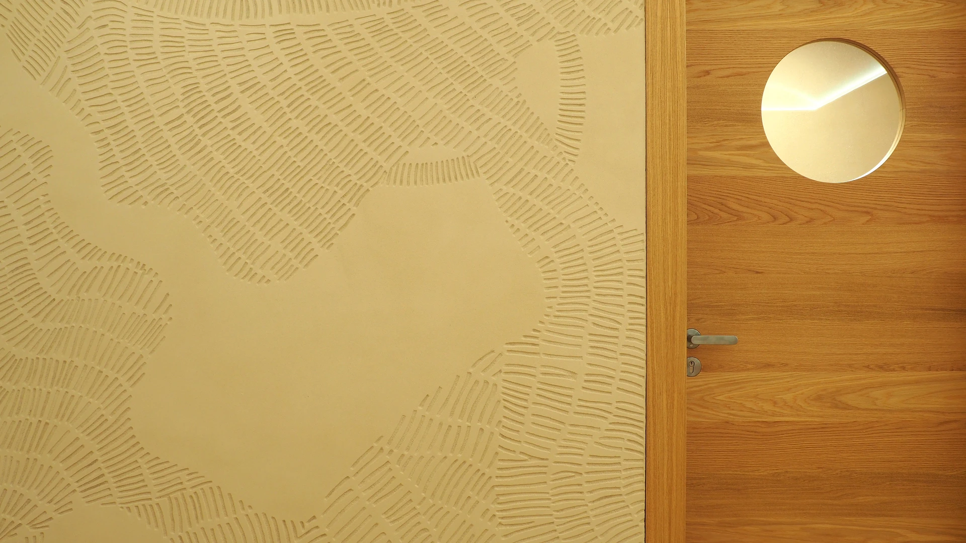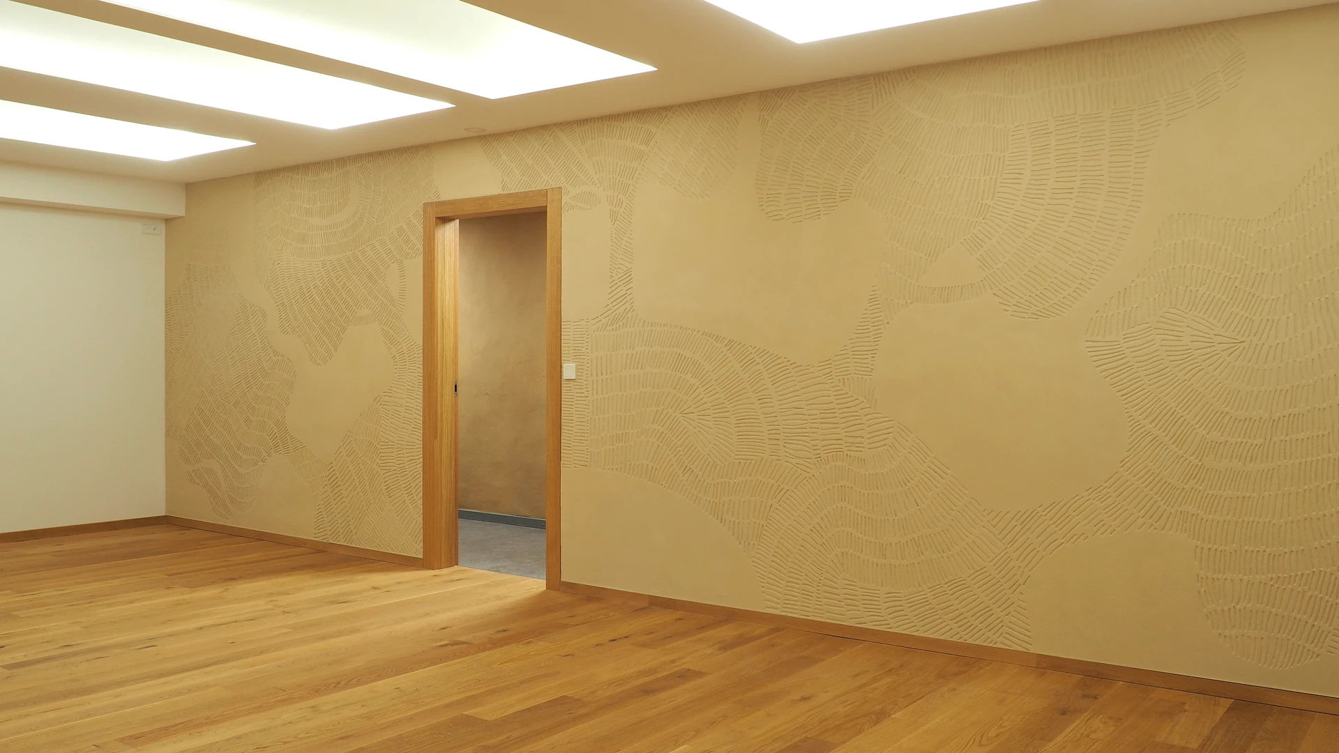 Sgrafito v jemné hliněné omítce realizované v sále určeném pro cvičení jógy, taiji a qigongu.