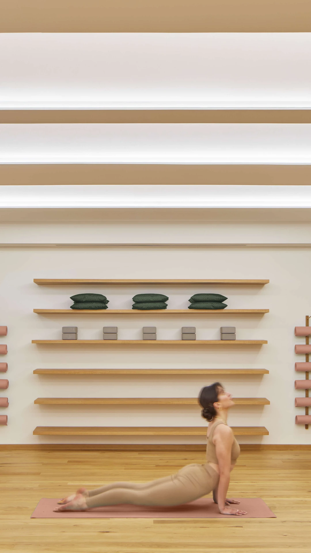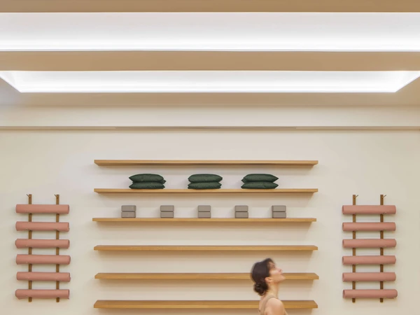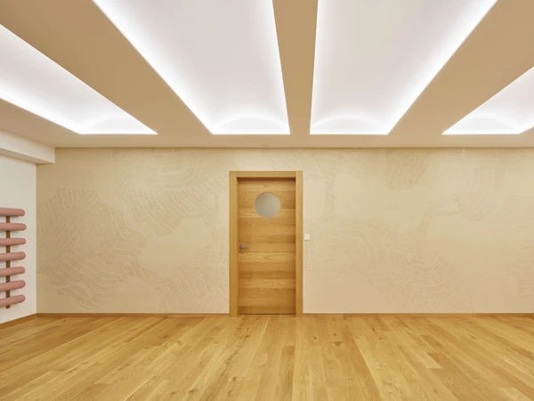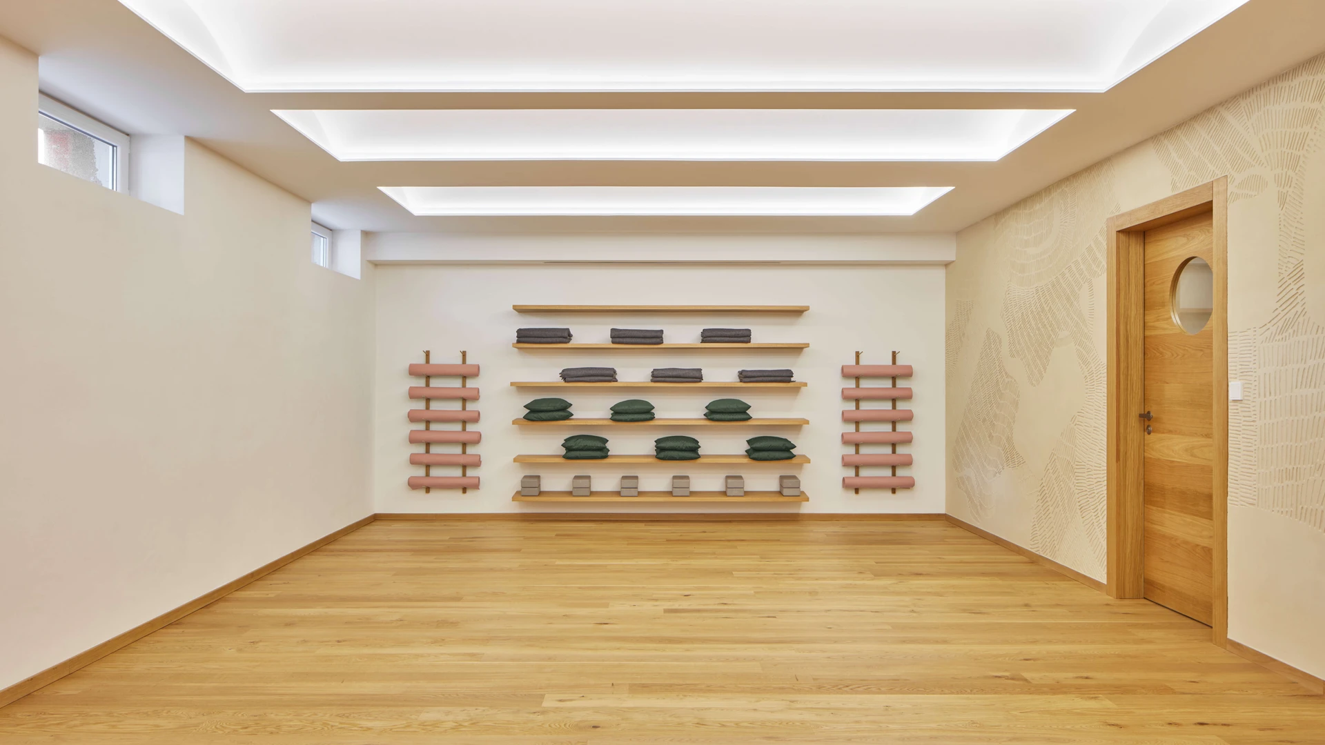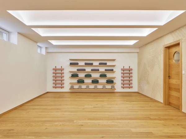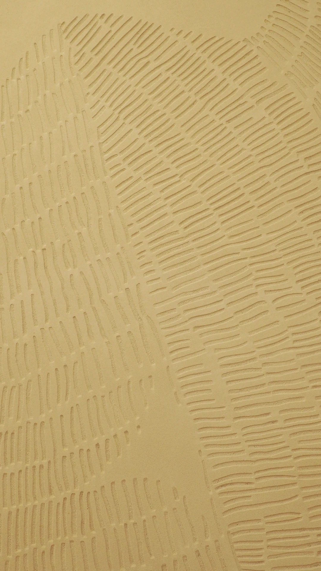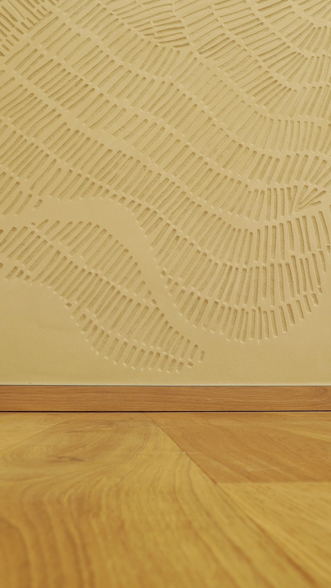 Sgrafito v jemné hliněné omítce realizované v sále určeném pro cvičení jógy, taiji a qigongu.