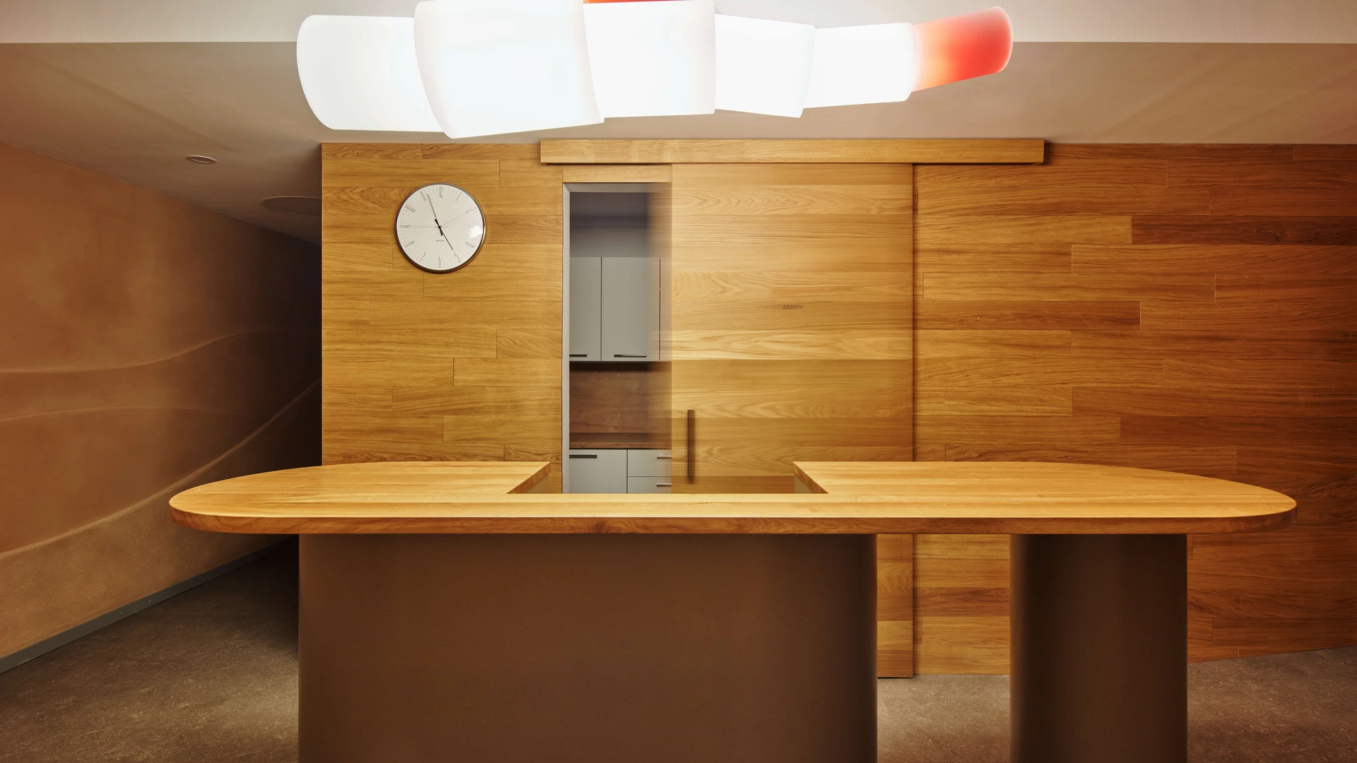 Záměrem bylo vytvořit decentní dekoraci, která zateplí prostor sálu, ale zároveň nebude příliš poutat pozornost. Proto je volena technika vyškrabování v rámci jedné barvy omítky a lehce abstraktní pojetí.