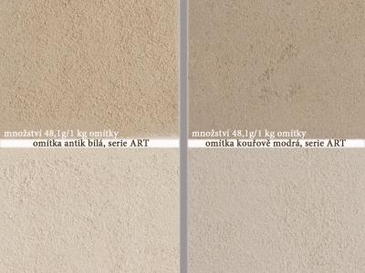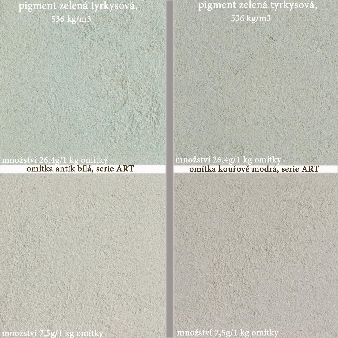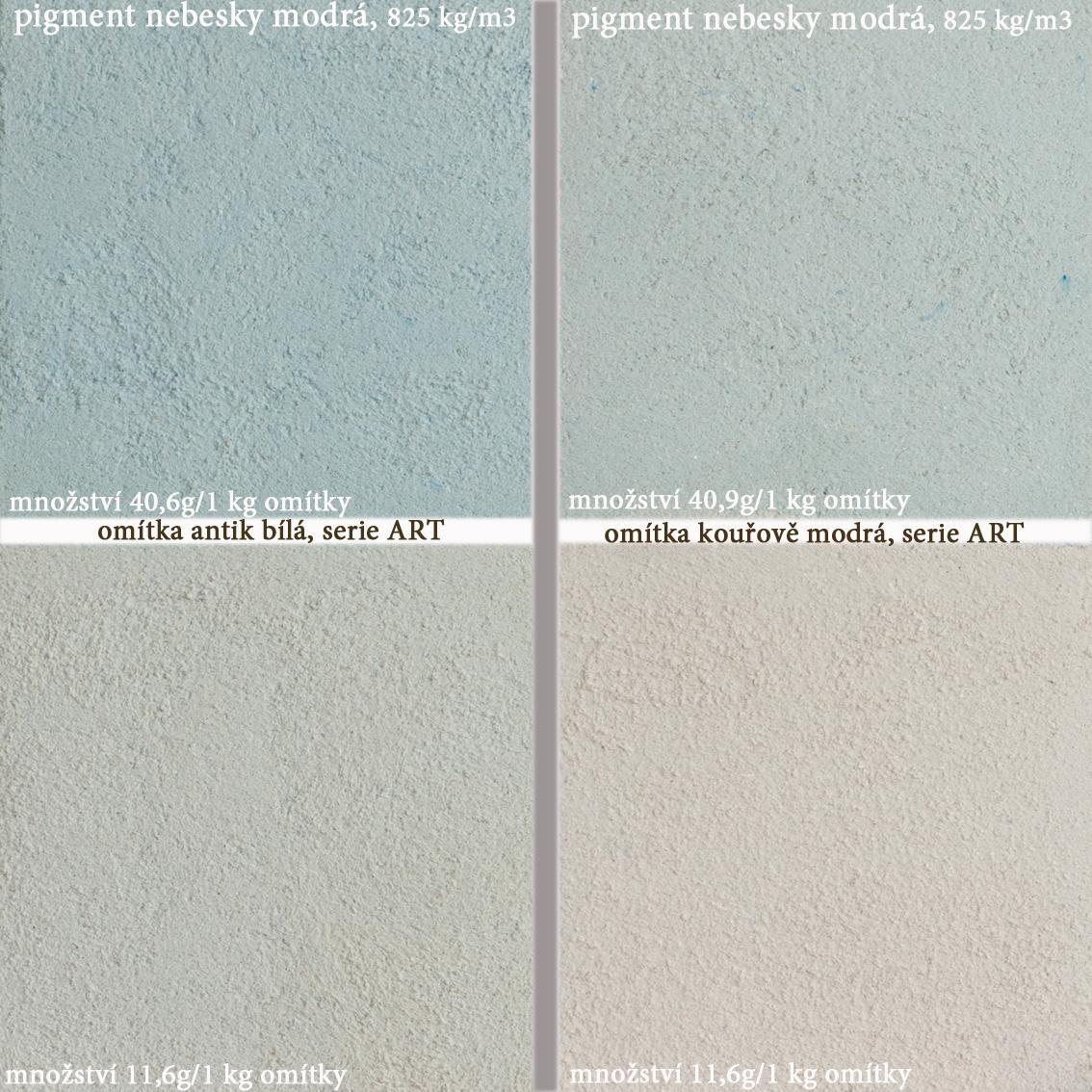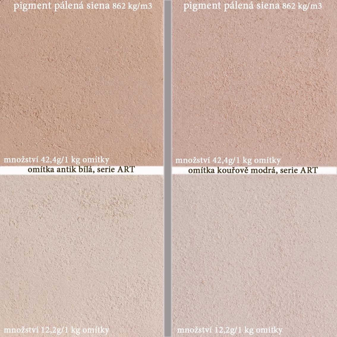 Vzorníky uvedené níže byly vytvořeny smícháním patřičného pigmentu s hliněnou omítkou antik bílá nebo kouřově modrá. Pigment namíchaný v omítce antik bílé je zářiivější a jasnější než v omítce kouřově modrá ze serie ART. Pigmenty je samozřejmě možné přidávat i do jiných sérií omítek nebo barev.